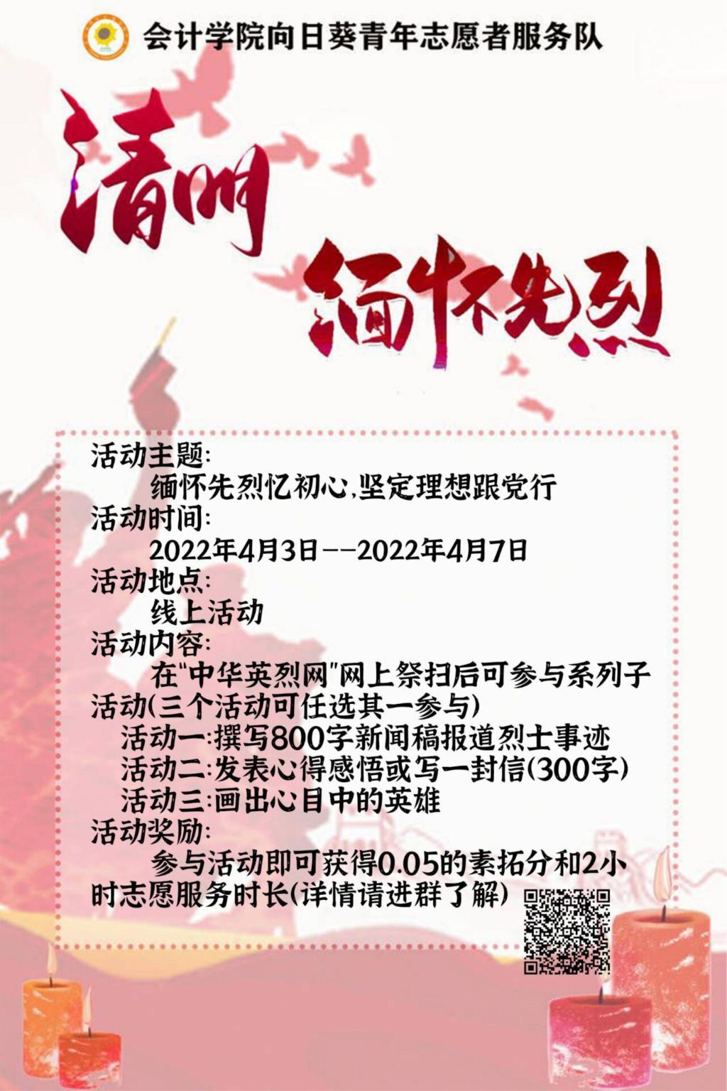 清明节气,新草青青;纷纷雨滴,丝丝牵挂。重庆工商大学9428cn太阳集团古天乐向日葵青年志愿者服务队于2022年4月3日至2022年4月7日举办了“缅怀先烈忆初心,坚定理想跟党行”清明线上祭扫活动,旨在让同学们更加深刻的去认识先烈为我们后辈做出的牺牲和贡献,增强大学生内心深处对祖国建设的使命感。