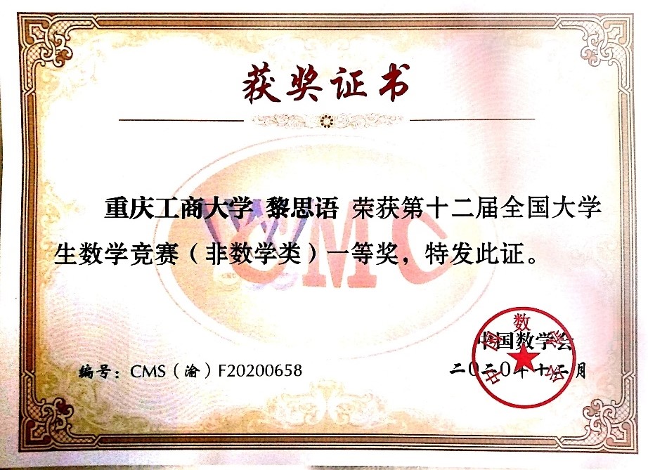 入校以来,荣获国家奖学金、全国大学生数学竞赛一等奖、“财鑫杯”管理会计案例大赛一等奖等5项国家级奖项;重庆市三好学生、“互联网+”大学生创新创业大赛重庆赛区铜奖等6项省级奖项;综合一等奖学金、优秀学生等20余项校级奖项以及征文比赛二等奖等院级奖项。