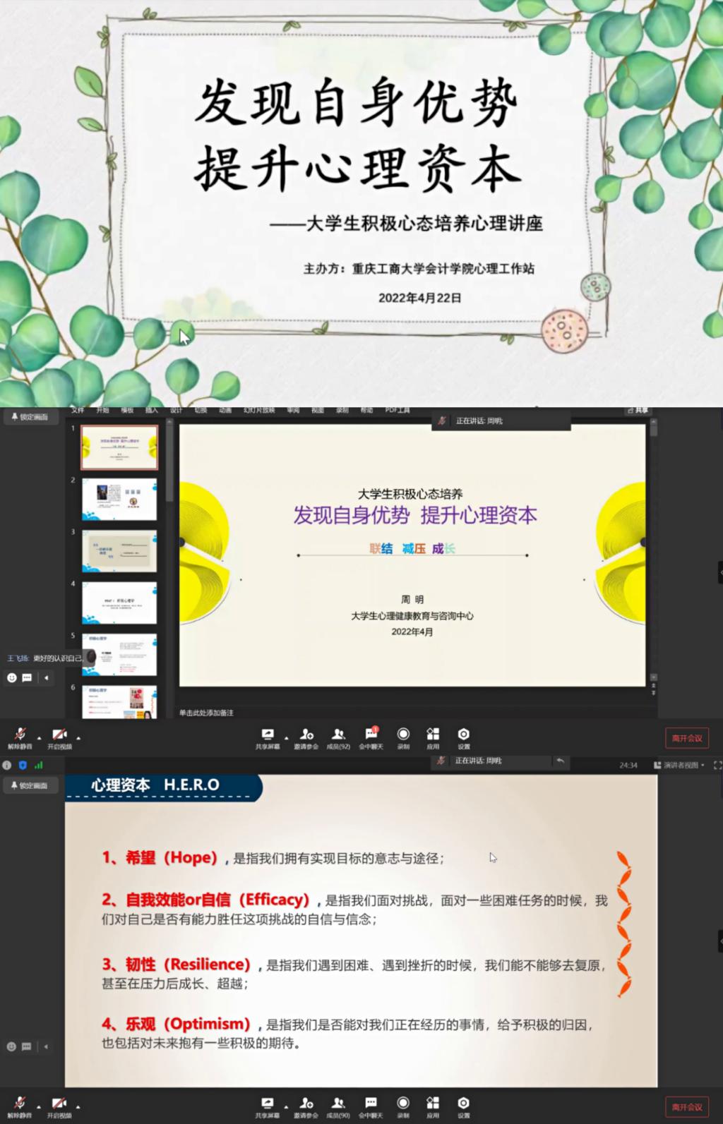 最后,周明老师讲述了大学生要如何进行心理资本开发,包括希望策略、自信策略、韧性策略和乐观策略。比如对大学生活充满希望,开发大自我效能感,理性应对逆境,促成乐观心态。