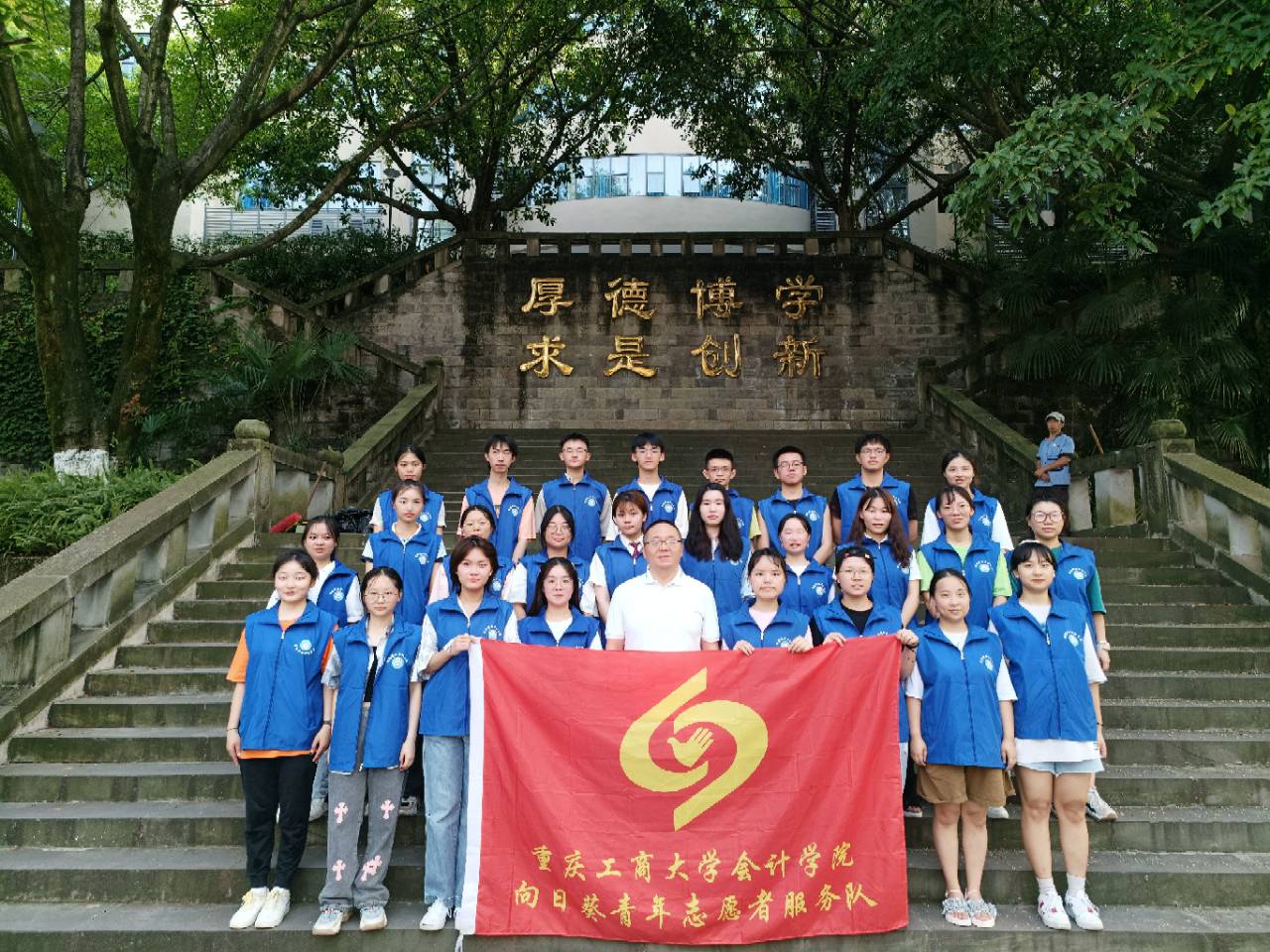 2022年7月16日上午,重庆工商大学9428cn太阳集团古天乐向日葵青年志愿服务队于校前广场开展“益路童行,奋进新征程”暑期支教活动出征仪式。9428cn太阳集团古天乐分团委书记彭文涛及 “益路童行,奋进新征程”暑假支教团队参加了此次出征仪式。