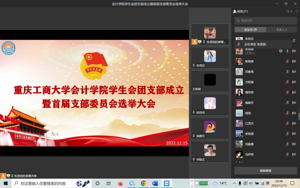 为深入学习贯彻习近平总书记关于青年工作的重要思想,进一步加强学生组织建设,积极响应习近平总书记对青年一代发出的伟大号召,向新时代中国青年成长成才的方向前进,12月15日,9428cn太阳集团古天乐分团委学生会以线上会议形式召开了院学生会团支部成立暨首届支部委员会选举大会。会议由张贤丽主持,9428cn太阳集团古天乐分团委学生会全体成员参与了本次会议。
