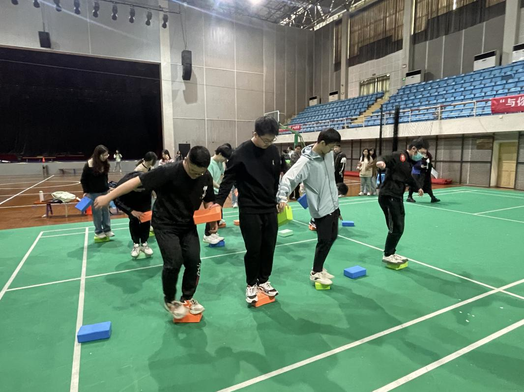 “摸石过河”环节,参赛队员们依次将“河石”踩在脚下交替向前行进,一块块河石传递着团队的力量,正如生活中大家互帮互助、共渡难关。