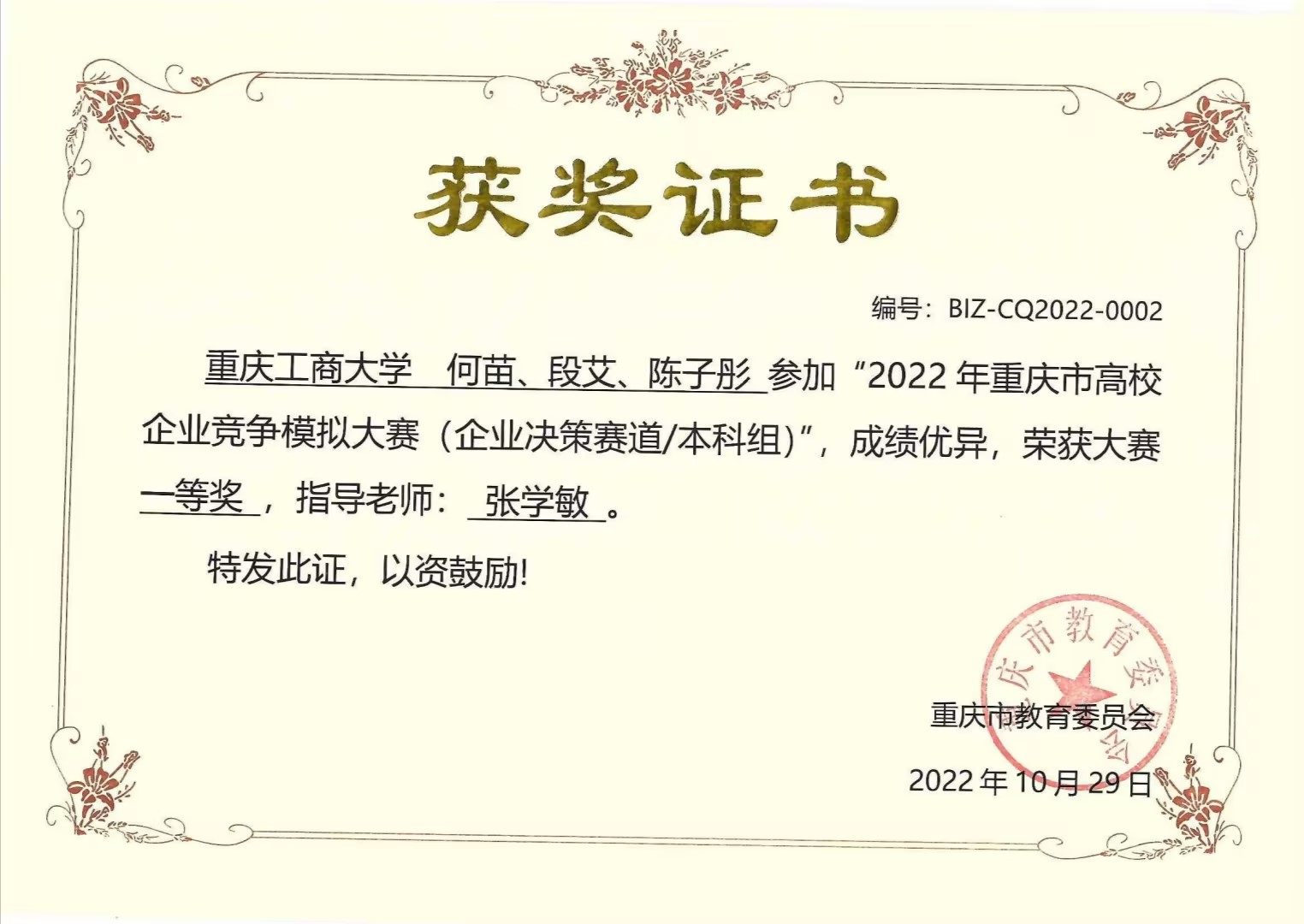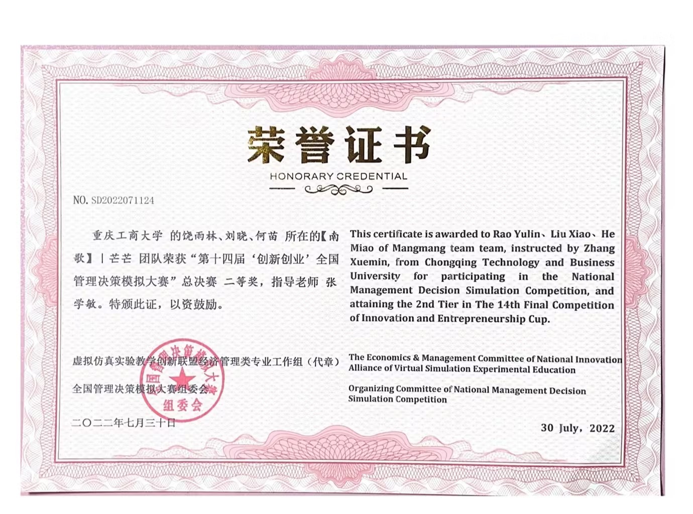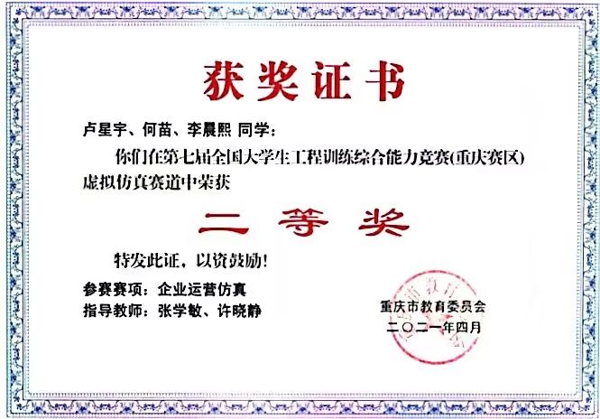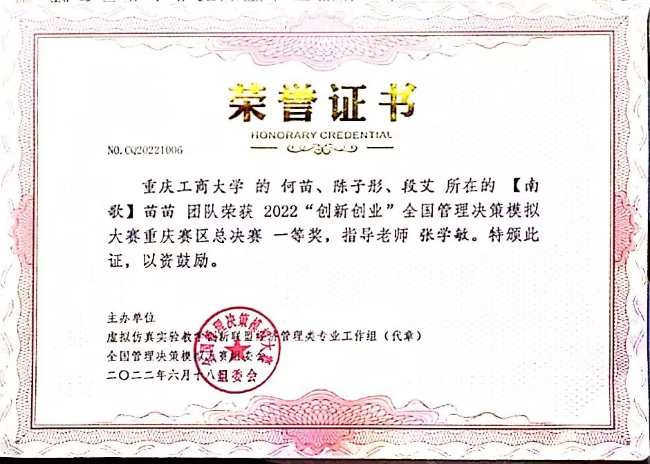 何苗,9428cn太阳集团古天乐2020级财务管理一班学生,ERP学生俱乐部会长,平均学年绩点:4.1,荣获2022年会计之星—科创之星称号。入校以来,荣获国家奖学金、全国企业竞争模拟大赛二等奖、全国管理决策模拟大赛二等奖等7项国家级奖项;第九届海峡两岸大学生职业技能大赛一等奖、第七届全国大学生工程训练综合能力竞赛(重庆赛区)二等奖、全国大学生数学竞赛三等奖等8项省级奖项;综合一等奖学金、优秀学生等20余项校级奖项以及征文比赛二等奖等院级奖项。