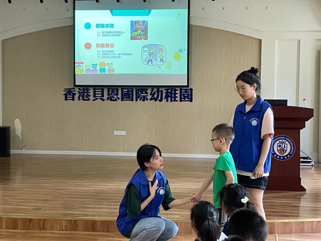 在学习如何防范拐骗后,志愿者小讲师利用情景模拟游戏,通过“假装求救”“伪装身份”等情景“迷惑”小朋友们,让孩子跟着“陌生人”走,大部分小朋友都能识别“迷惑”,勇敢拒绝,不跟“陌生人”走,保护好自己。