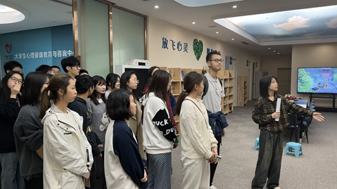 活动伊始,心理中心的负责老师带领同学们参观了中心的各个功能室,包括:情绪宣泄与调剂室、身心减压室、生物反馈心理训练室、沙盘游戏辅导室以及职业生涯指导训练室。中心负责老师一边讲解一边回答同学的提问,还鼓励大家积极与中心保持联系,如果有需要中心帮助的地方可通过线上或线下的方式进行预约。
