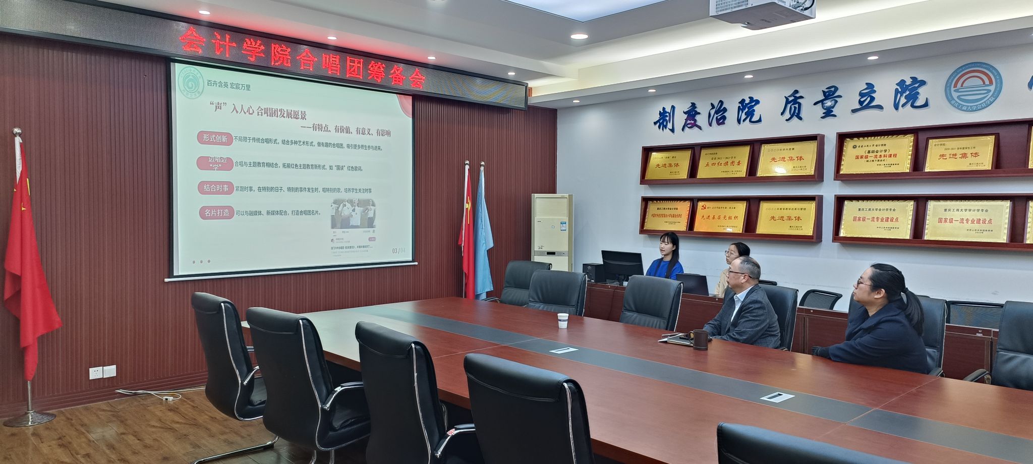 学院卉宸艺术团团长黄子洁分别从组织结构介绍、学年活动计划、活动开展总结、未来展望四个维度进行2023年艺术团工作汇报;从发展规划、组织结构、团员发展等多个维度对合唱分团的成立进度进行了充分汇报。
