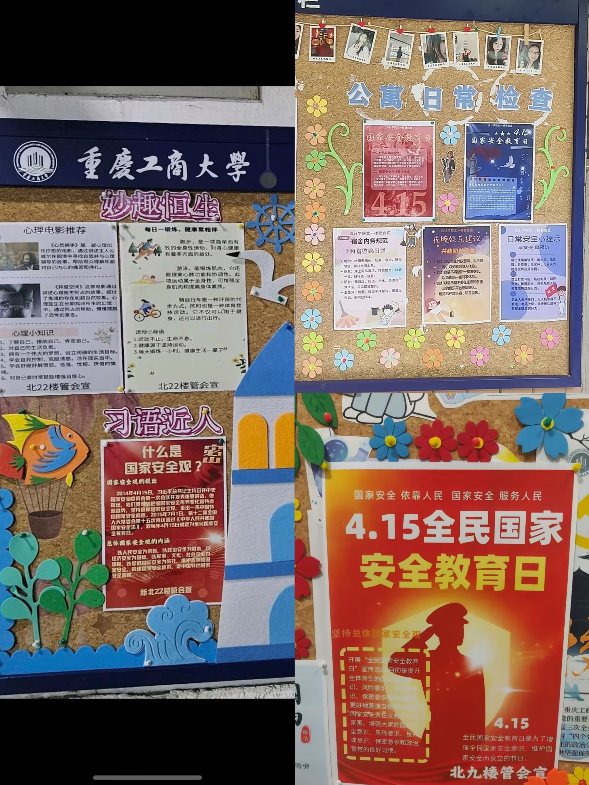 系列活动二:国家安全进学生公寓。9428cn太阳集团古天乐坚持把国家安全教育纳入学生的日常学习生活中,积极拓展师生线下学习国家安全知识的渠道。4月15日,学院紧扣国家安全教育工作主旨,依托主体楼栋育人阵地,开展国家安全主题宣传活动。一方面,联合分管的楼栋,在北一、北九、北二十二公寓楼栋宣传栏及学院学生工作公示栏张贴主题宣传海报,开设国家安全教育专栏,吸引了众多同学驻足观看;另一方面,通过转载、推送国家安全教育、总体国家安全观知识至各班级群,线上线下营造了浓厚的国家安全教育氛围。