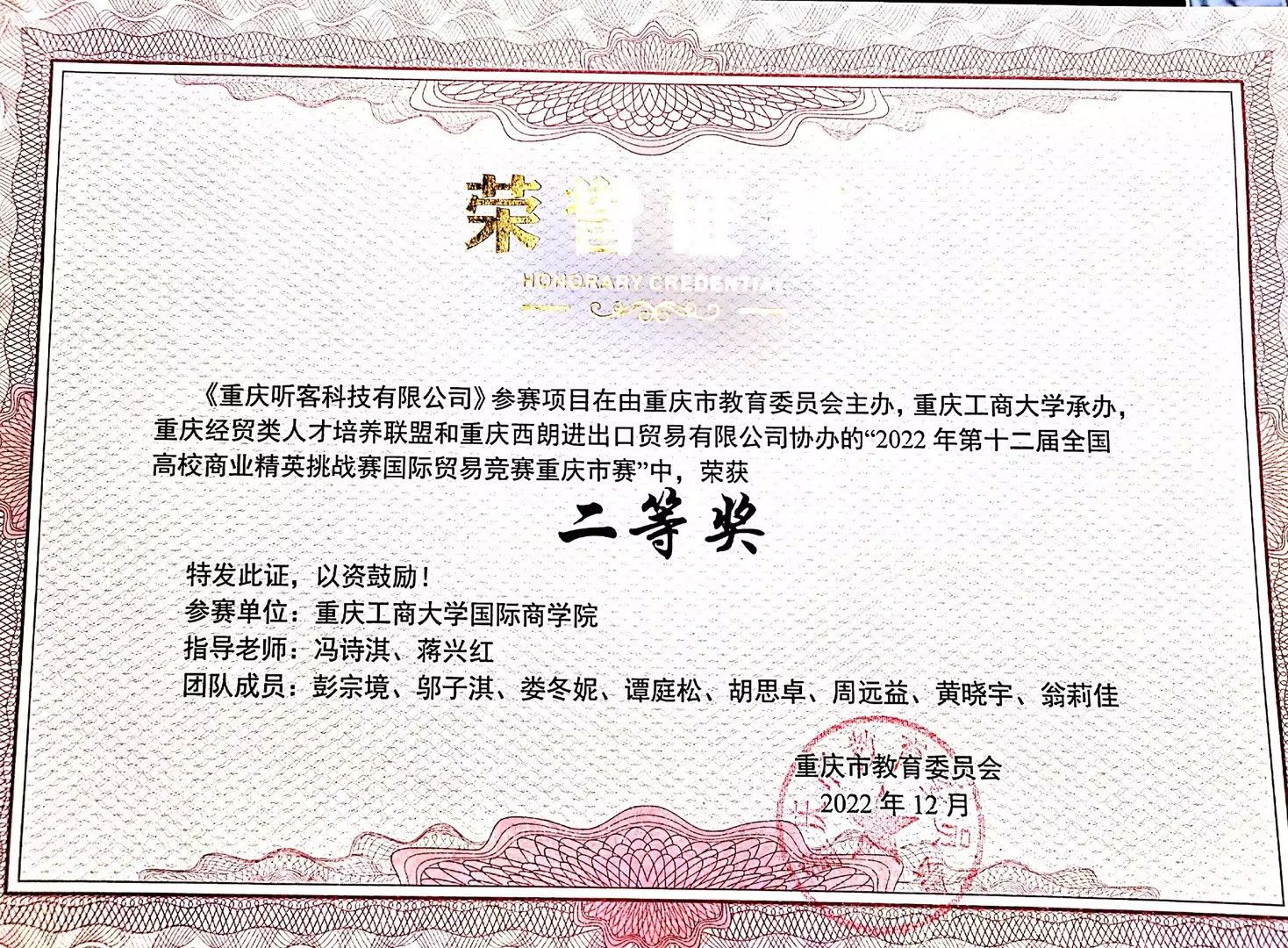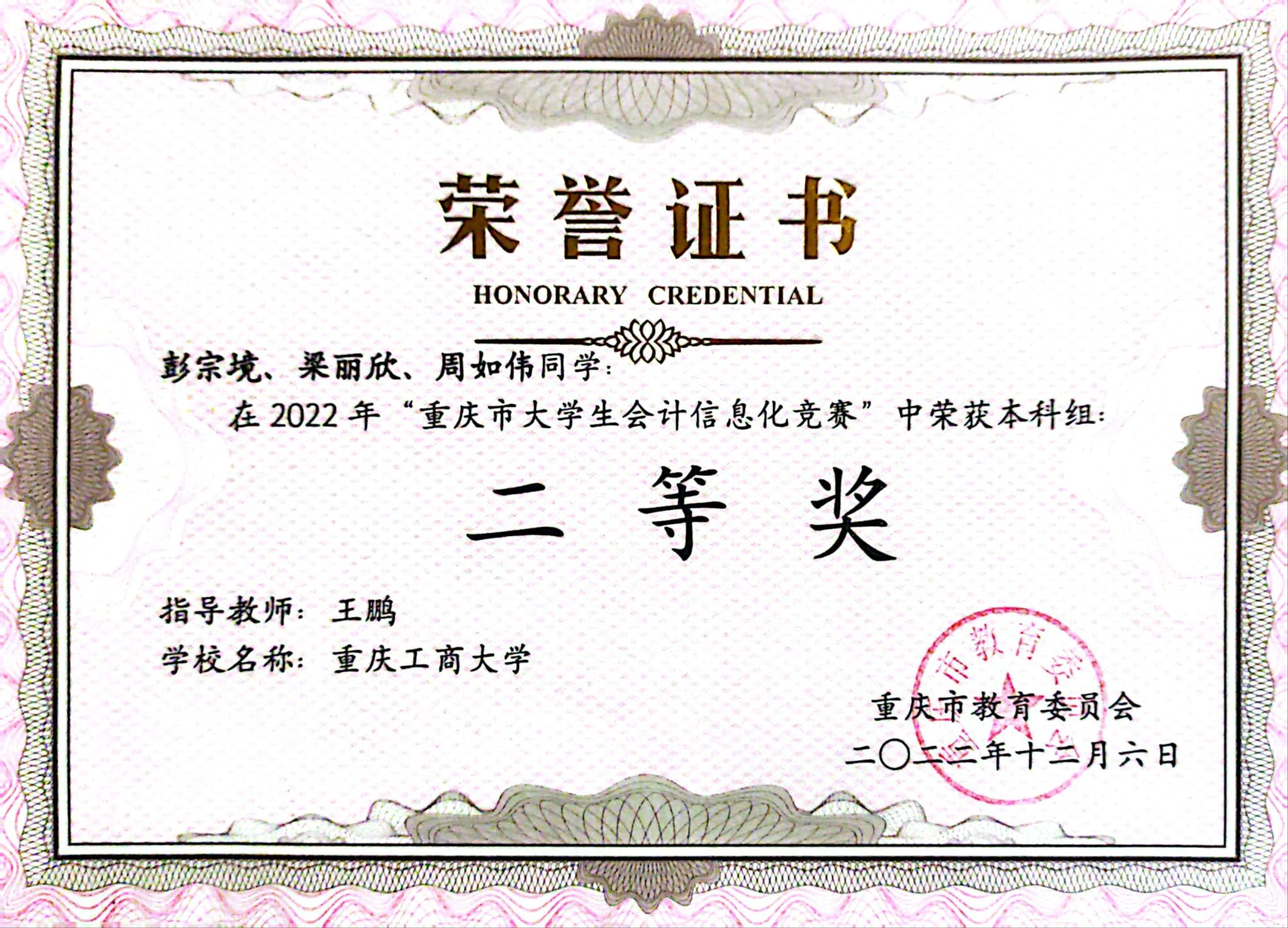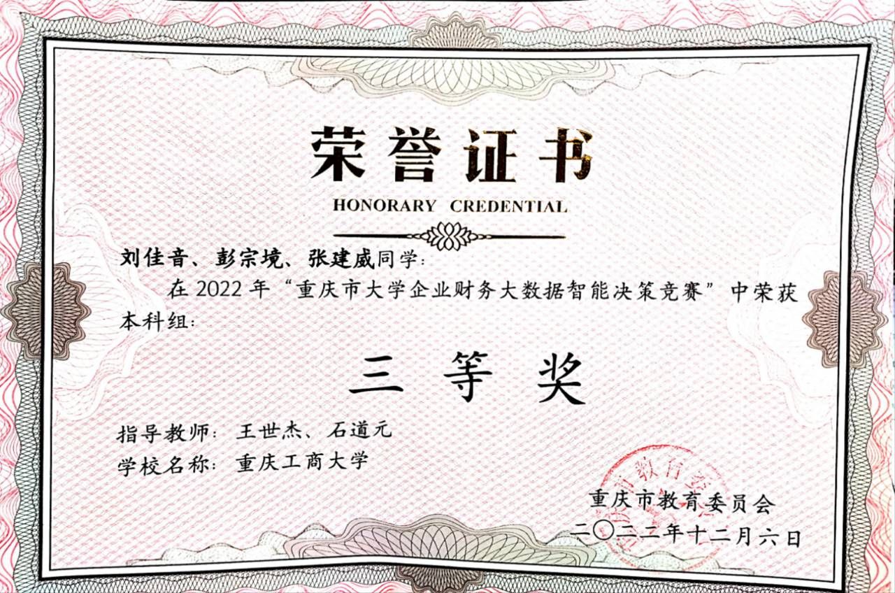 在学习之余,彭宗境同学积极参加各类学科竞赛,提高自身的综合能力,不断拓宽自己的知识面。曾多次担任队长,带领团队共同努力,并取得了较好的成绩。荣获第三届财经素养大赛决赛金奖、第十四届创新创业全国管理决策大赛总决赛三等奖、重庆市会计信息化竞赛二等奖、第十二届全国高校商业精英挑战赛国际贸易竞赛市级二等奖等。回想起来,那些和团队伙伴一起努力的备赛时光,总是快乐并且难忘的。学科竞赛是充满意义的校园经历,它不仅提高了自身的综合能力以及运用理论知识于实际案例的实践,也锻炼了沟通协调能力,因此认识并结交了很多朋友,使校园生活更加多姿多彩。