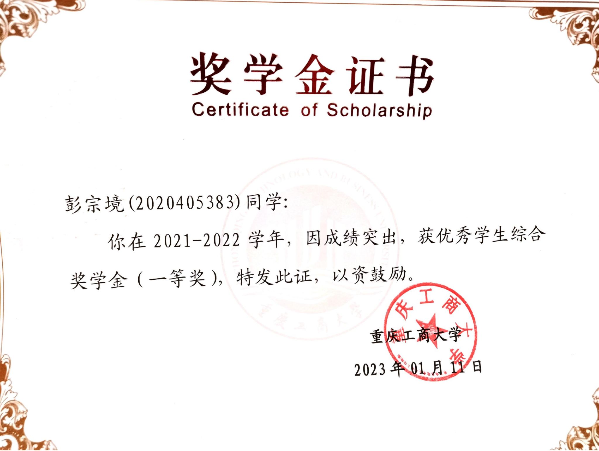 彭宗境 2020级会计一班,中共预备党员,荣获2022年会计之星—自强之星称号。曾荣获国家励志奖学金、综合一等奖学金、科创奖学金、励志之星等,曾获重庆市三好学生、重庆市优秀毕业生、重庆市志愿服务活动先进个人、优秀团干部等20余项;多次参与学科竞赛,荣获全国大学生财经素养大赛会计案例分析金奖、全国商业精英挑战赛会计案例赛国家级二等奖、会计信息化竞赛市级二等奖、全国商业精英挑战赛国际贸易赛市级二等奖等26余项。