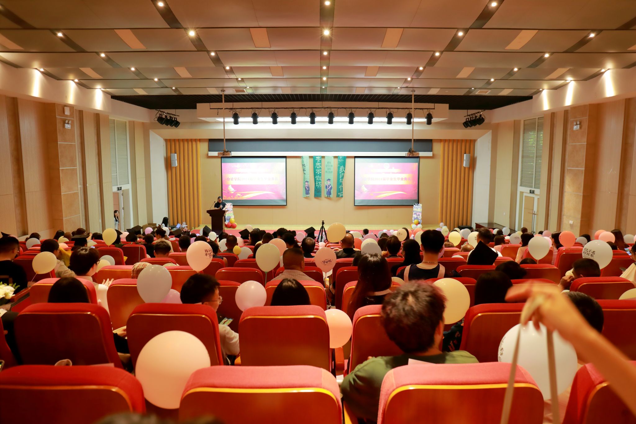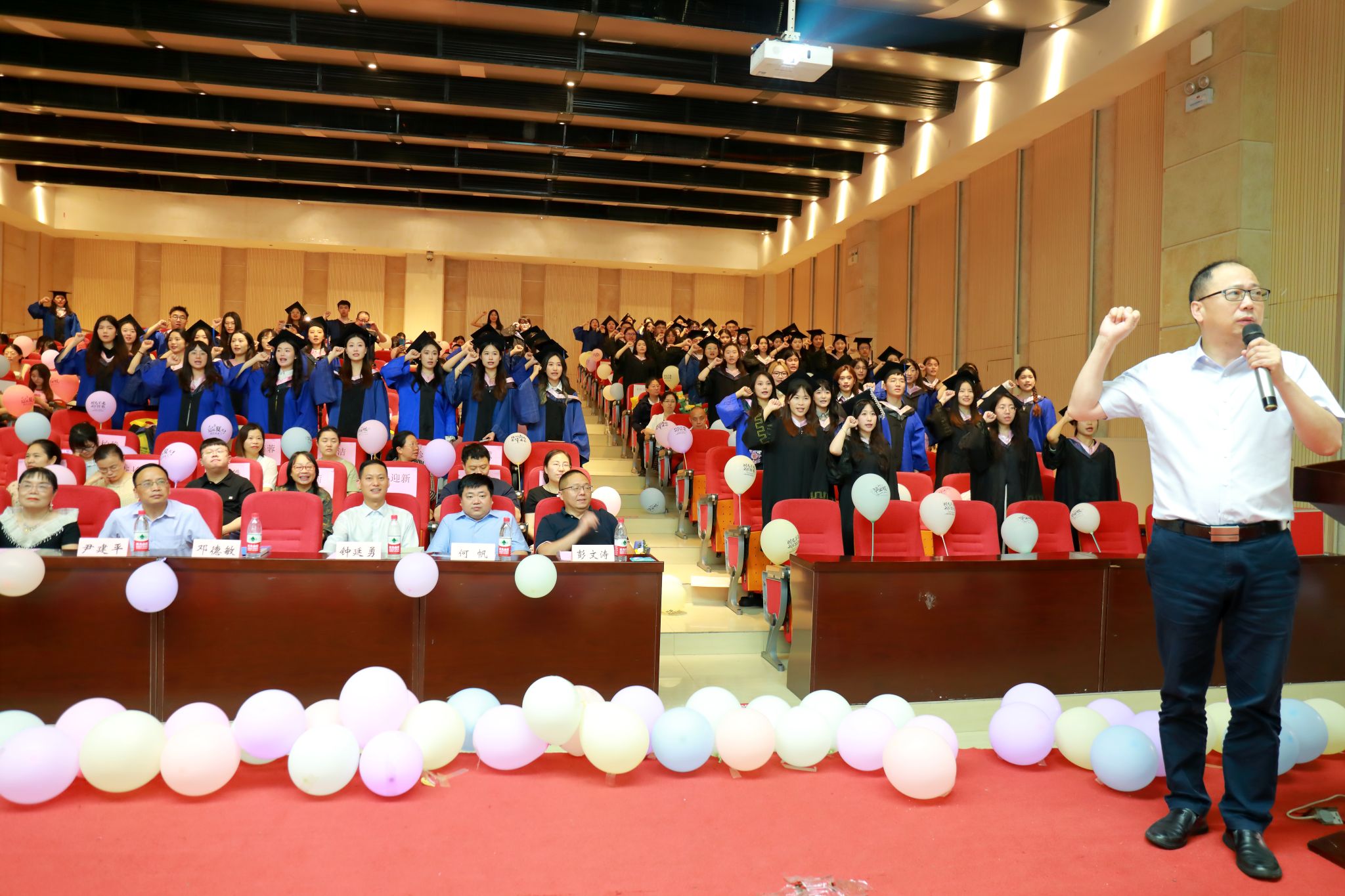 典礼最后,举行了庄重的诚信从业宣誓,全体毕业生举起右手,庄严宣誓,在邓德敏的领誓下,齐声高诵:牢记殷殷嘱托,服务祖国建设;坚守诚信根本,走好会计人生;见贤思齐,崇德励志;坚持准则,守正创新;奉公守法,廉洁自律;敬业守责,敢于斗争;精益求精,理财兴业,富国利民,圆梦中华;为全面建设社会主义现代化国家而努力奋斗!