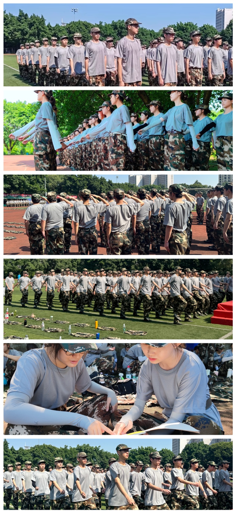 下午,雨渐停,一缕阳光显现,同学们继续进行着军事训练。烈阳高照,这是对身体的考验,也是对意志的磨练。一滴滴汗水从脸颊划过,这就是会院学子吃苦耐劳、刻苦训练最好的证明。
