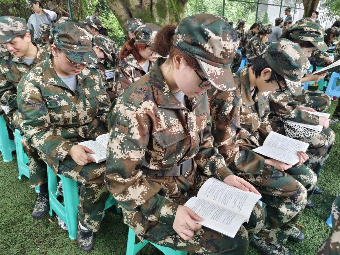尽管不能亲自上阵,但跟训连的队员们有着严格的纪律。他们不能随意玩手机,不大声讲闲话,甚至连坐姿都有严格的要求。有时候,他们会练习长时间的静坐,培养耐心和毅力。不仅如此,跟训连的同学们还承担着记录军训生活的重任。他们撰写新闻稿,用文字记录下同学们军训中的点点滴滴;他们拍照记录,用镜头捕捉那些动人的瞬间;他们督促、检查内务,帮助同学们养成良好的内务习惯;他们帮忙考勤,确保训练队伍整齐有序。站岗哨,也是每一个跟训连队员都要经历的任务。在烈日的炙烤下,他们笔直地站在那里,目光如炬,守护着这片训练场。虽然只是静静地站着,但他们的内心却充满了对军人的敬仰和对国家的忠诚。空闲时刻,教官会带着他们学习军歌,每当军歌响起,他们歌声嘹亮,斗志昂扬...他们也会和各连队的同学们一起放声高歌,气势磅礴。