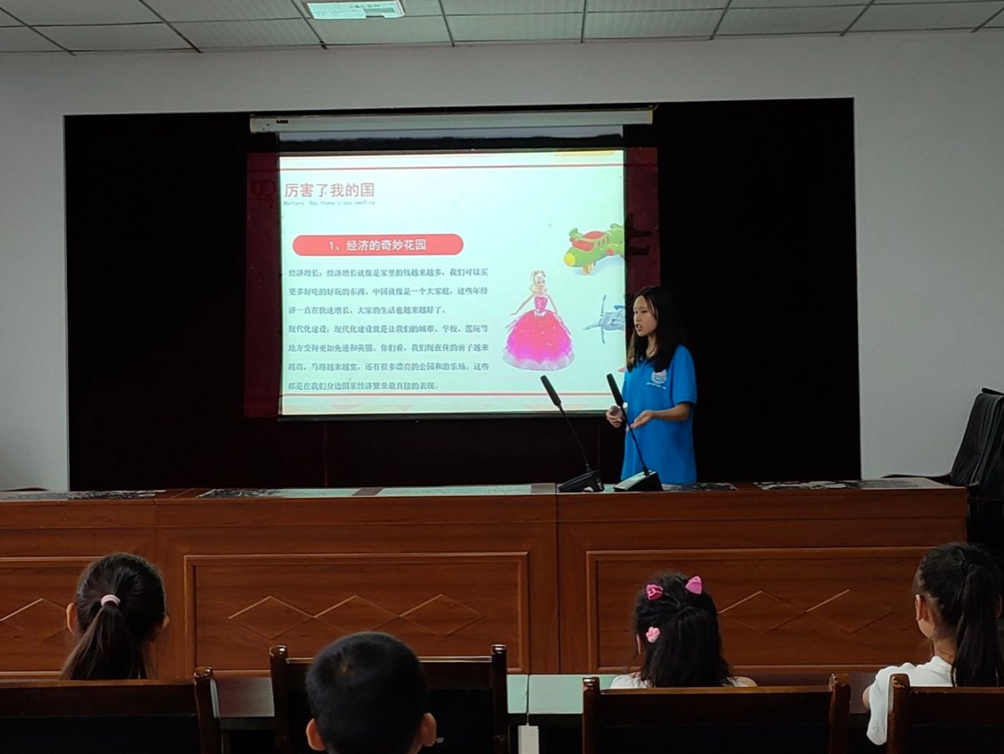 德育的第二节课为自豪课,志愿者由上节课的国旗国徽过渡到如今中国的繁荣,并分别从经济、科技、文化、社会、民族和公益六个方面讲解中国繁荣。在讲解经济繁荣时,志愿者采用经济增长比作家里的收入增加这一通俗易懂的比喻,让小朋友们更加理解经济增长的含义;在讲解科技创新时,志愿者将科技创新比作变魔术,并引导小朋友们感受身边的科技创新实例;在讲解文化传承时,志愿者从传承文化和现代文化两方面讲解文化繁荣,感受文化的魅力。志愿者们巧妙地将中国繁荣表现与实际生活相结合,引导孩子们在感受中国繁荣的同时,深刻体会到中国繁荣是真真切切的,不是虚假的。