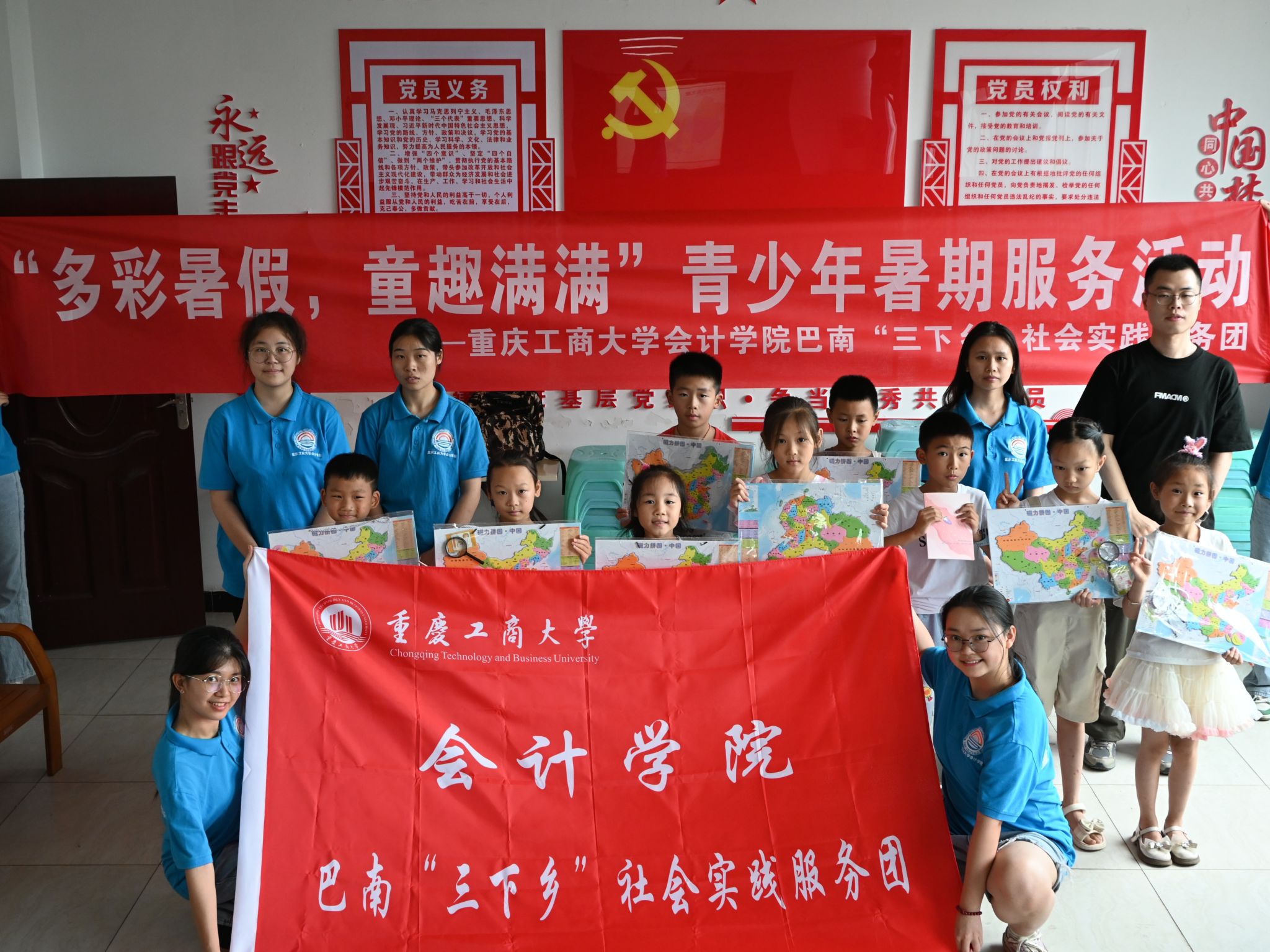 为学习贯彻习近平新时代中国特色社会主义思想,加强新时代爱国主义教育,传承和弘扬爱国主义精神,重庆工商大学9428cn太阳集团古天乐“多彩暑假,童趣满满”青少年暑期服务团于2024年7月10日上午在重庆市巴南区南泉街道金古村顺利开展了“多彩暑假,童趣满满”青少年暑期服务活动德育课堂。