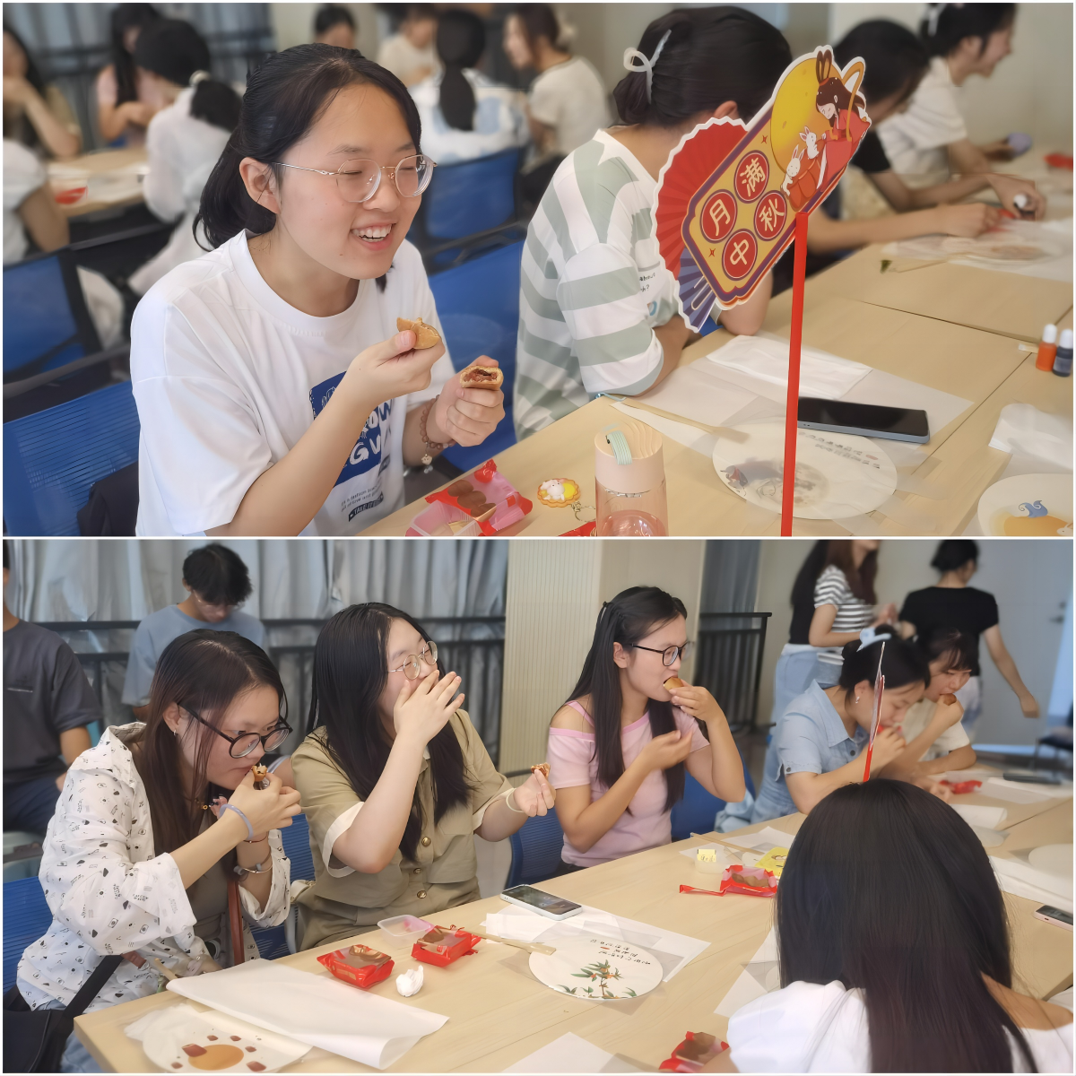 春花秋月何时了,馅料之争一直吵,广式、苏式、滇式、潮式……,蛋黄、莲蓉、五仁……,同学们一边分享着各自喜欢的月饼馅料及口味,一边品尝着美味的月饼。