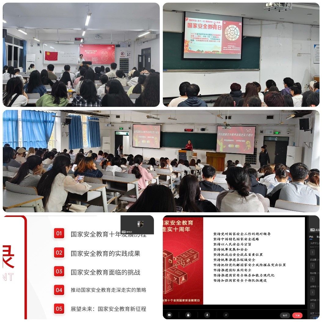班会上,回顾了国家安全教育十年发展历程;呈现了国家安全教育的实践成果;也分析了当今国际形势下国家安全教育面临的主要挑战;学习了推动国家安全教育走深走实的策略;并展望未来,描绘了国家安全教育新征程的图景;也启迪广大青年学子在国家安全事业中的重要使命。