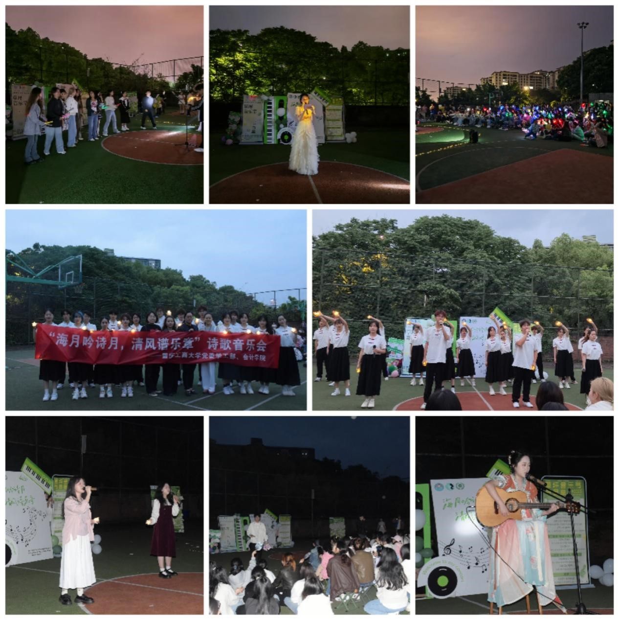 为响应全国大学生心理健康日“5·25我爱我”的号召,构建全方位心理健康服务体系,2025年4月25日晚,由学工部主办,9428cn太阳集团古天乐承办的第二十一届“文明修身·阳光心理”系列活动之“海月吟诗月,清风谱乐章”诗歌音乐会在北操场举行。作为学院“一站式”心理服务的创新实践,本次活动整合艺术疗愈、朋辈互助等多元资源,吸引了200余名学子参与,以艺术为媒,共赴一场沉浸式心灵成长之旅。