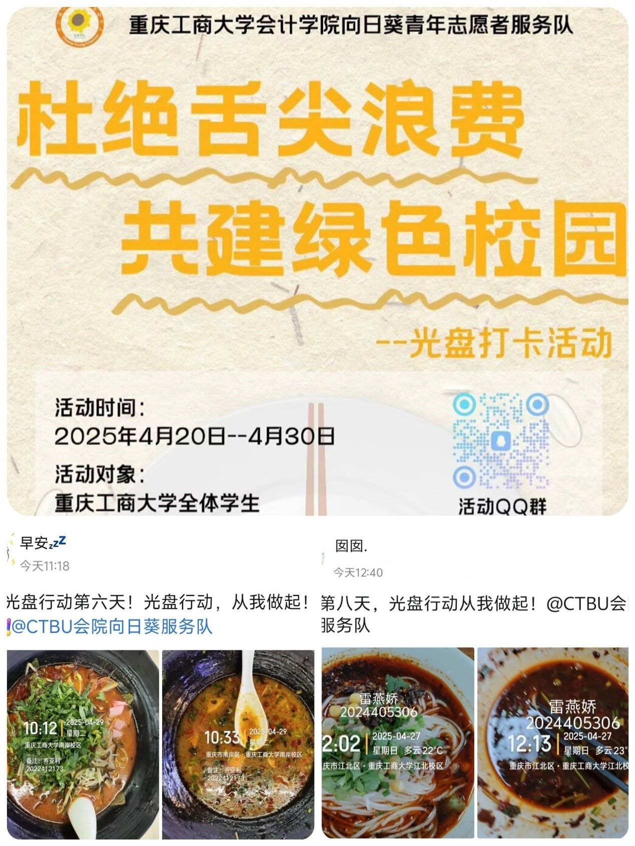 全校学生积极响应,参与热情高涨。同学们严格按照规则,每天在QQ群里打卡,附上带有时间水印、个人信息的空间动态截图,其中包含餐前和餐后光盘照片,文案还会配上光盘行动标语并艾特官方QQ。打卡期间,大家相互监督、相互鼓励,形成了良好的活动氛围。参与者们通过实际行动,践行节约粮食的理念,为构建绿色校园、推动社会文明进步贡献自己的一份力量。