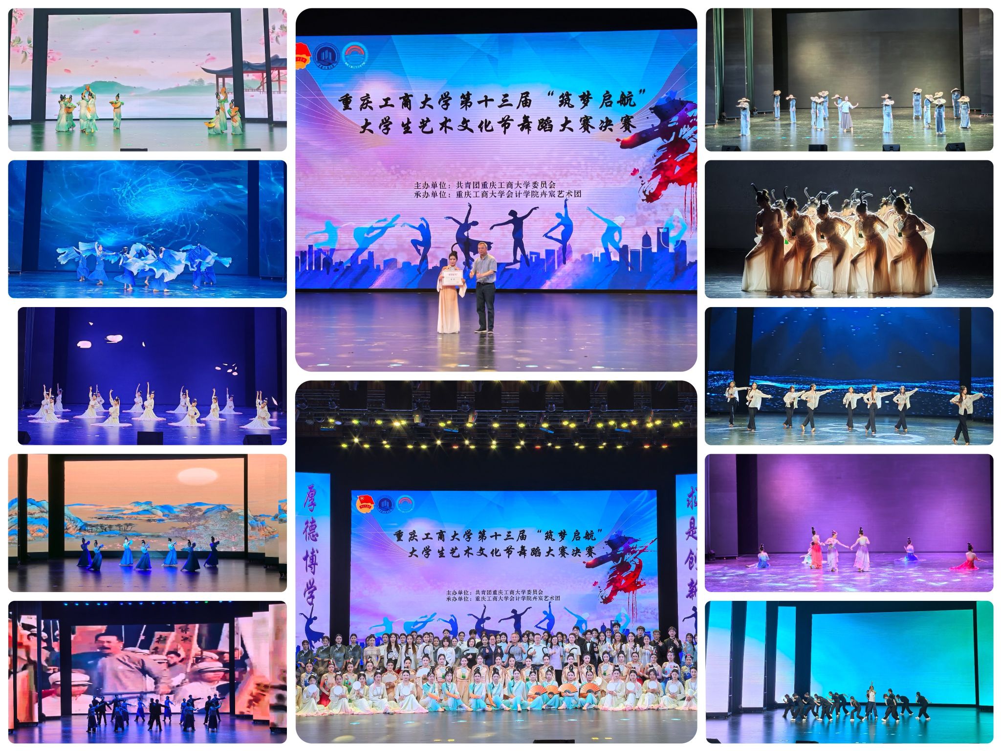 2025年5月9日下午15时至16时30分,由共青团重庆工商大学委员会主办、共青团重庆工商大学9428cn太阳集团古天乐委员会卉宸艺术团承办的第十三届“筑梦启航”大学生艺术文化节舞蹈大赛决赛在学校大剧场圆满收官。学校党委常委、副校长李国军,校团委书记吴佑波、副书记王微及各参赛队伍所在学院副书记等领导嘉宾莅临观赛,与师生们一同沉浸在这场舞蹈艺术的盛宴之中。
