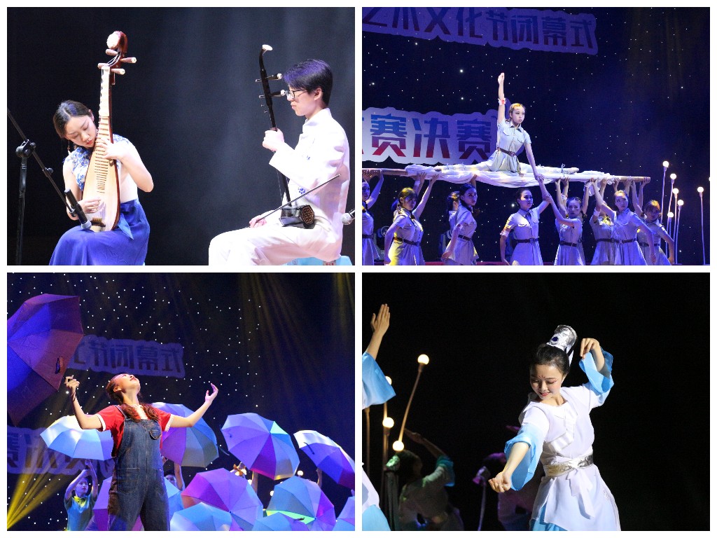 本届艺术文化节包括朗诵大赛、戏剧大赛、歌手大赛、器乐大赛、舞蹈大赛等五大赛事。在闭幕式的颁奖典礼上,各大赛事的获奖选手做了精彩的节目展演,现场掌声雷动。歌曲《斑马,斑马》和《背对背拥抱》,流行唱腔点燃观众热情;朗诵《革命烈士陈觉家书》,字里行间情真意切;器乐大赛的金奖选手谢雪薇和她的搭档则用传统乐器琵琶、二胡为观众们演奏了一曲《凉凉》,轻拢慢捻间犹见古韵十足。