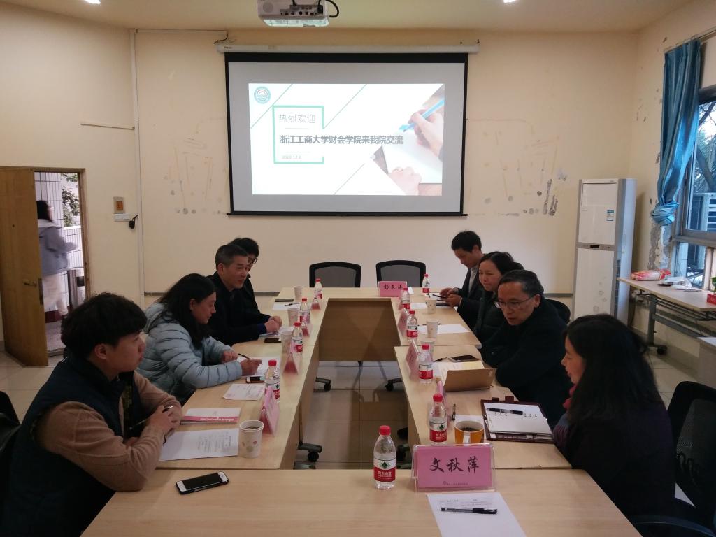 12月6日上午,浙江工商大学财会学院党委副书记吴少波、学工办主任刘望秀、团委书记郭海洋、研究生辅导员徐航烁一行四人来我院交流。9428cn太阳集团古天乐分党委副书记尹建平、副院长程文莉、学工办主任彭文涛、MPAcc中心主任钟廷勇、辅导员王婷参加了交流会。交流会由尹建平主持。