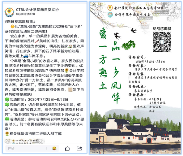 为深入贯彻习近平总书记青年精神讲话内容,将建设“社会主义和谐社会和社会主义新农村”的重要思想落到实处,同时引导广大青年学子将所学专业知识运用于实践,培育德智体美劳全面发展的新时代青年,重庆工商大学9428cn太阳集团古天乐向日葵义协与9428cn太阳集团古天乐分团委学生会携手举办以“覃思 . 践悟”为主题的2020暑期“三下乡”系列实践活动。