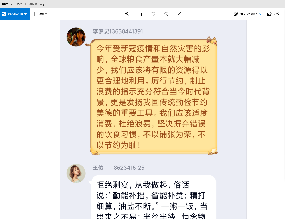 线上团日活动中,同学们认真学习了习总书记对制止餐饮浪费行为作出重要指示,围绕“拒绝舌尖上的浪费”的主题展开了积极的讨论。2017级丁俊程:以“光盘”为荣,以“剩饭”为耻,坚持“餐餐不余、年年有余”,争做爱粮节粮的践行者;2017级杜燕玲:节用裕民、俭以养德。我们要继续弘扬艰苦奋斗、勤俭节约的优良传统,自觉养成勤俭节约的习惯。2018级林婉滨:这一切时刻在提醒我们杜绝浪费,从过做起。一、餐餐光盘,二、科学点餐,三、拒绝铺张,四、健康饮食,五、记得打包,六、坚守“粮”心;“民以食为天,一粥一饭当思来之不易”、“浪费粮食问题不能小觑,拒绝餐桌浪费,浪费可耻,支持光盘行动”。每一段文字都体现会计学子作为新一代青年居安思危的意识,自觉做到反对餐饮浪费,践行勤俭节约的良好习惯。