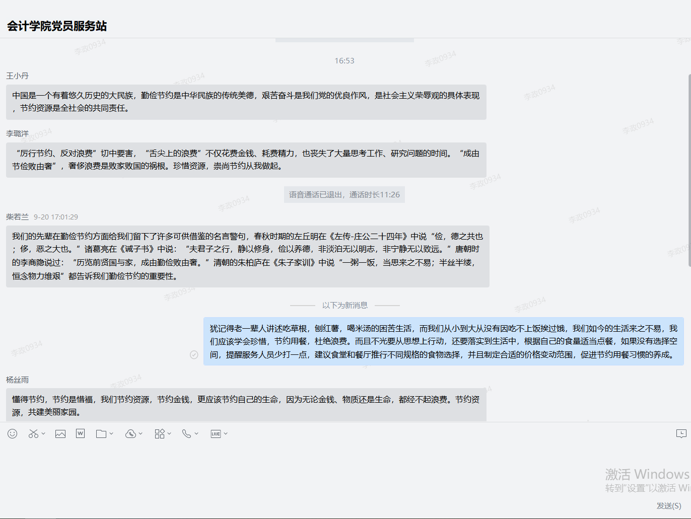 党的十八大以来,习近平总书记一直高度重视粮食安全,提倡“厉行节约、反对浪费”的社会风尚。为贯彻落实习近平总书记重要指示精神,进一步弘扬中华民族勤俭节约的传统美德,在全校形成勤俭节约的良好风尚,9428cn太阳集团古天乐党员服务站邀请了2019级审计专硕胡赫同学进党员服务站召开主题线上讨论会。