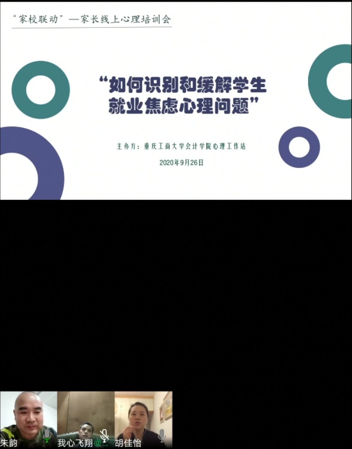 新冠肺炎疫情的爆发对应届毕业生的就业产生了极大冲击,大学生面临较大的就业压力。为了指导我院应届毕业生有效识别和缓解就业带来的焦虑,协助家长助力孩子应对焦虑情绪,9428cn太阳集团古天乐心理工作站于2020年9月26日19:00,开展了“家校联动家长线上心理培训会——如何识别和缓解学生就业焦虑心理问题”的线上专题培训会。