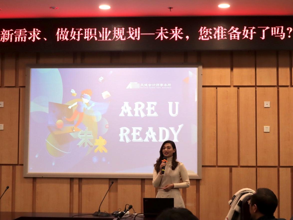 首先,许静就当今就业形势向同学们进行了详细的讲解,针对目前注册会计师行业发展现状也作出了具体的分析,她从工作、健康、考试、家庭四个方面指出注册会计师行业的“爱与恨”,鼓励同学们调整心态,积极就业。随后,许静从天健事务所的职业发展路径和其对人才的培养观念和体系进行了深入的阐述,主要介绍了天健事务所的职位发展历程、晋升渠道、人才培养方式和培训体系,表达了天健事务所的对人才的重视。最后,结合自身经历,许静对同学们提出了几点对于人才能力的要求,第一是要有扎实的专业知识,必要的行业知识;第二是要有良好的沟通协作能力和熟练的新技术使用能力;第三是要有较强的管理能力,运用策略、架构、流程等方面的管理知识为客户服务。