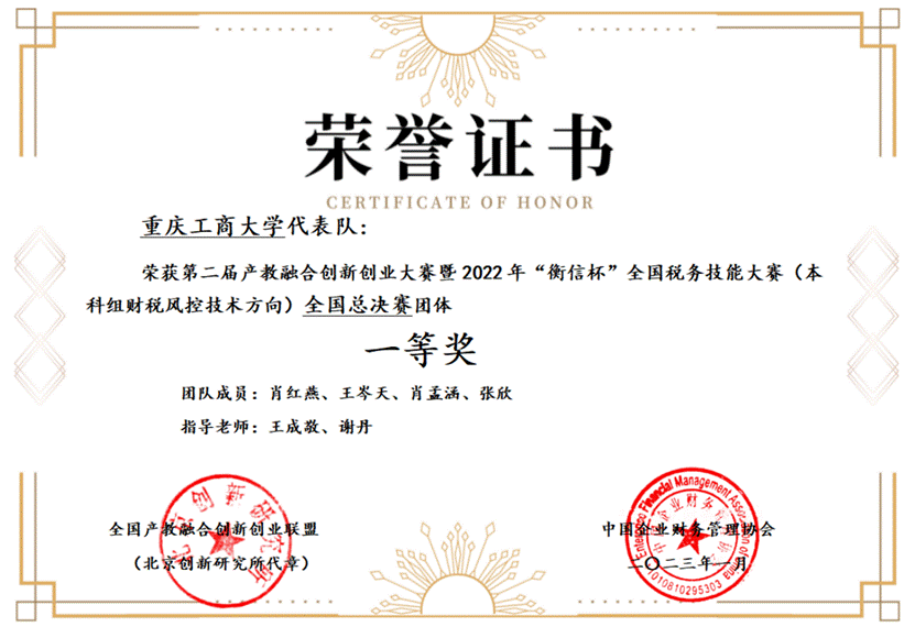近日,第二届全国产教融合创新创业大赛暨 2022 年“衡信杯”全国本科院校税务技能大赛在线上落下帷幕。由我校9428cn太阳集团古天乐王成敬老师和经济学院谢丹老师共同指导的本科代表队一路披荆斩棘,表现优异,斩获全国本科院校税务技能大赛一等奖,刷新了我校参加该项赛事以来取得的最好成绩。