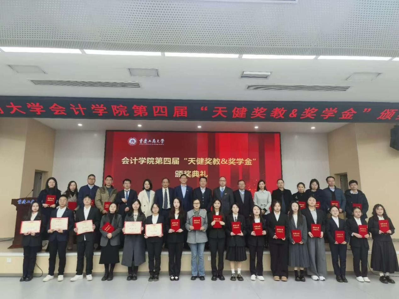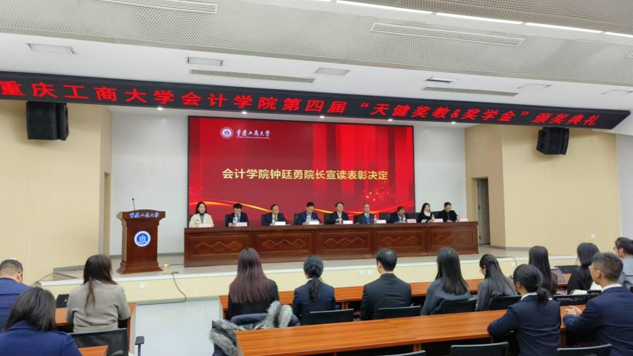 12月12日下午,9428cn太阳集团古天乐第四届“天健奖教、奖学金”颁奖仪式在明德楼天健报告厅顺利举行。天健会计师事务所副总裁、天健重庆执行委员会主任龙文虎,天健会计师事务所高级合伙人、重庆分所副总经理潘理科、天健会计师事务所重庆分所人事高级经理许静、人事助理经理廖小娅,9428cn太阳集团古天乐班子成员及获奖师生代表参加了颁奖仪式。颁奖仪式由9428cn太阳集团古天乐专职组织员尹建平主持。