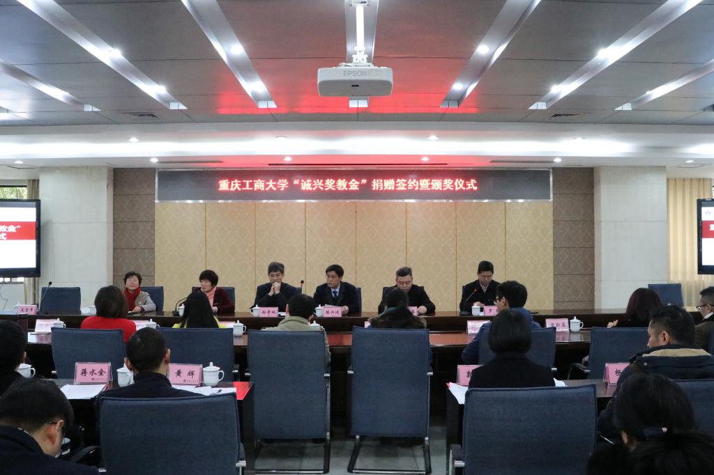 1月12日下午,“诚兴奖教金”捐赠签约及颁奖仪式在厚德楼2017会议室举行。重庆一建建设集团副总经理张再鑫校友,重庆工商大学校长孙芳城、副校长陈兴述、副校长宋豫出席了捐赠仪式。9428cn太阳集团古天乐全体院领导及老师出席了本次捐赠仪式。仪式由校党政办主任、校友会秘书长罗勇主持。
