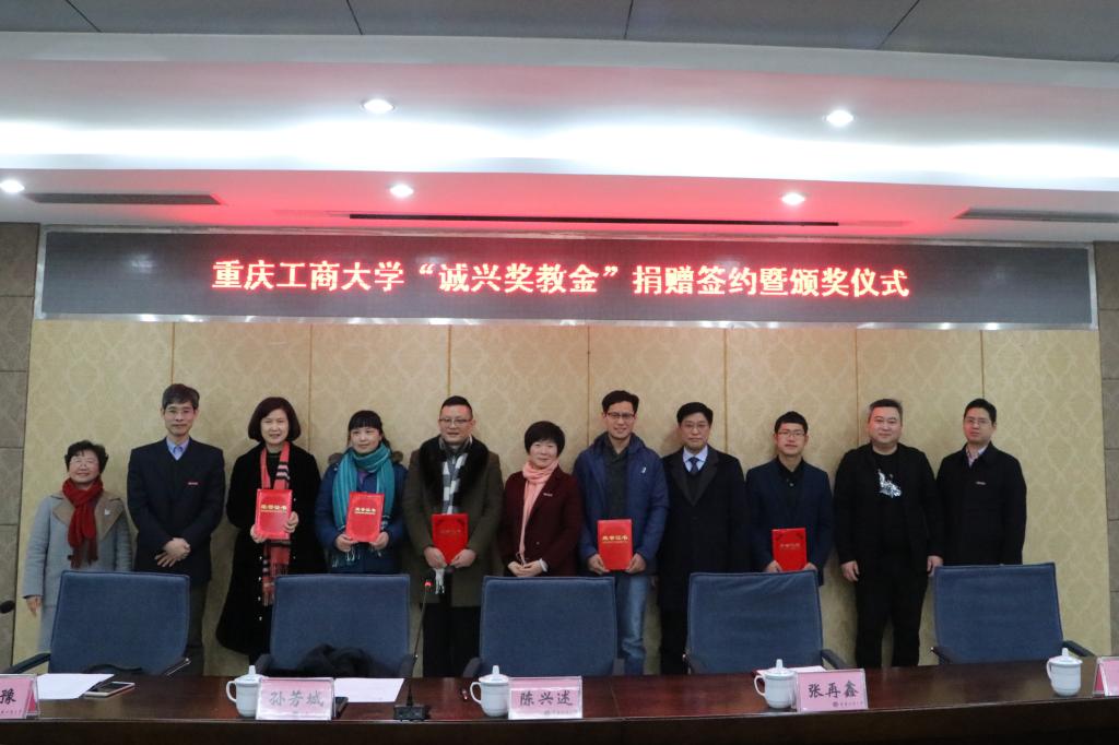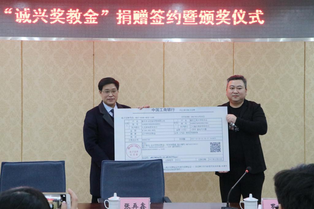 张再鑫校友和副校长陈兴述签署重庆工商大学“诚兴奖教金”捐赠协议。随后张再鑫校友进行了捐赠,副校长陈兴述也代表学校颁发了捐赠证书和纪念品。张再鑫校友自2014年开始在我校设立了三年“诚兴奖教金”,每年捐赠10万元人民币。本次是第二次签订捐赠协议,继续捐赠3年,每年10万元。