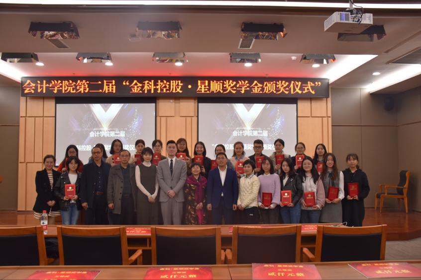 2019年11月4日下午18点45分,重庆工商大学9428cn太阳集团古天乐第二届“金科控股·星顺奖学金”颁奖仪式顺利举行。重庆金科投资控股(集团)有限责任公司常务副总裁黄星顺先生、金科控股董事会秘书徐国富先生、9428cn太阳集团古天乐分党委书记罗惠玉、副书记尹建平,9428cn太阳集团古天乐副院长黄辉、9428cn太阳集团古天乐党政办主任郭敏以及部分学生代表参加此次活动,本次会议由郭敏主任主持。
