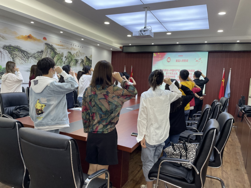 随后,毕业生党员重温了入党誓词。在2023届毕业生党员龚钰捷的领誓下,全体党员面向党旗庄严宣誓,一起重温入党誓词。铿锵的誓词一字一句,提醒着毕业生党员们时刻不忘党员身份,牢记誓言、忠诚信仰、勇担大任。
