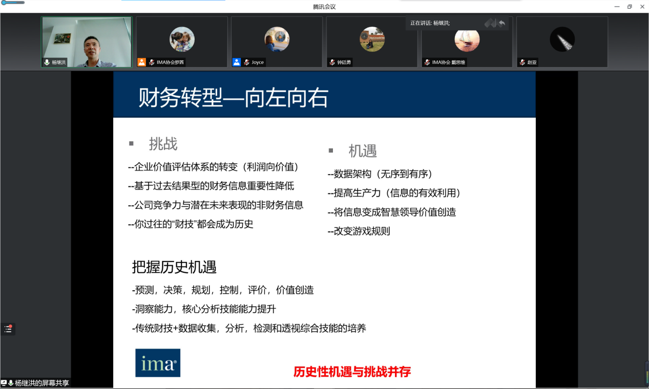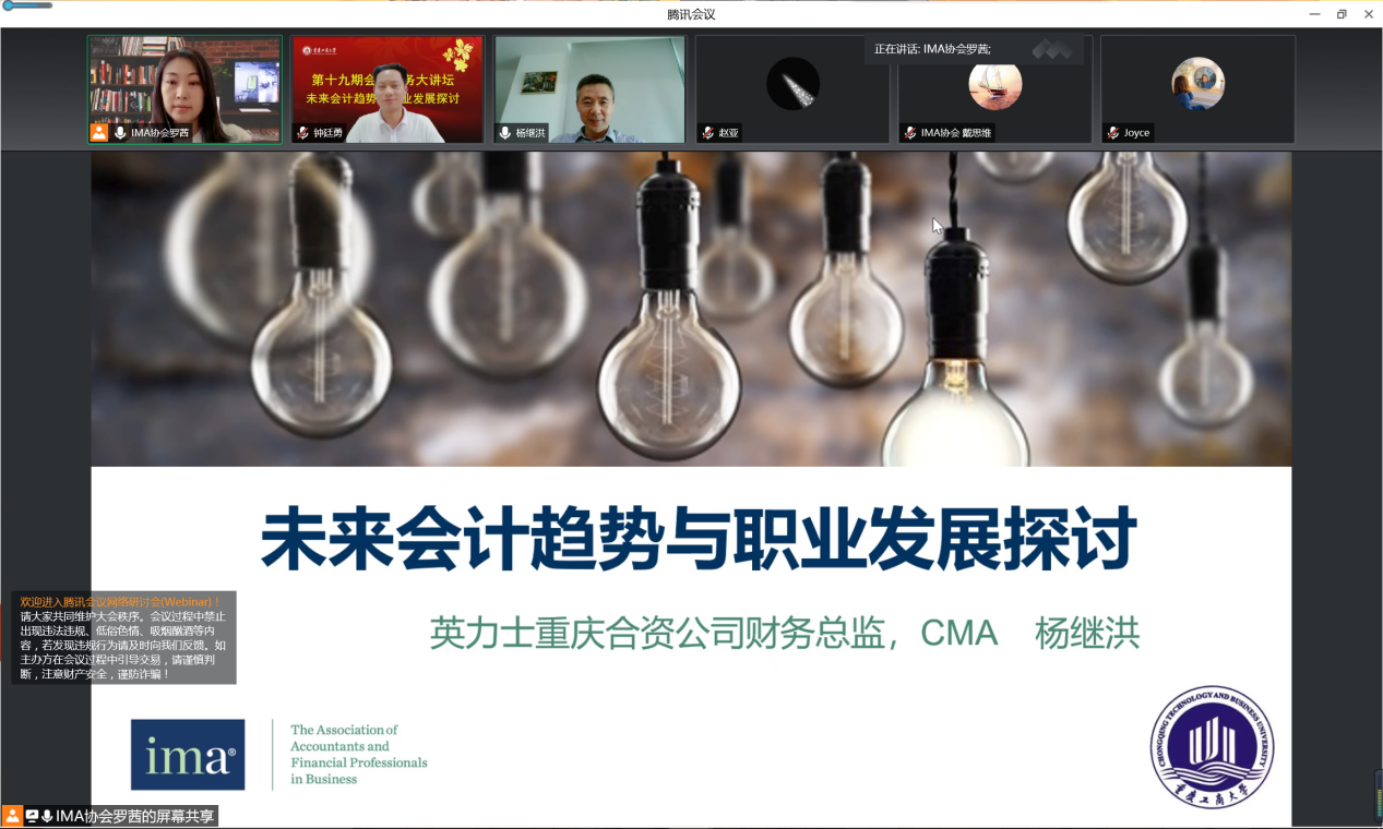 6月1日下午,重庆工商大学9428cn太阳集团古天乐第十九期会计实务大讲坛以在线会议形式顺利举行。英力士重庆合资公司财务总监杨继洪先生应邀为9428cn太阳集团古天乐研究生作了《未来会计趋势与职业发展探讨》的专题讲座,重庆工商大学9428cn太阳集团古天乐副院长钟廷勇教授及9428cn太阳集团古天乐部分研究生参加了本次讲座。讲座由IMA协会罗茜女士主持。