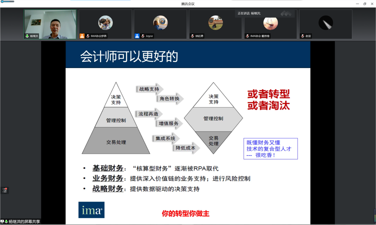 随后,杨继洪以未来会计师素质框架为实现路径,明确了未来会计师需要具备战略规划和分析、商业敏锐度和运营、报告和控制等六大能力。通过“基础核算型财务”逐渐被RPA取代的实例,杨继洪强调,在“RPA+AI”已然成为未来发展趋势的背景下,熟悉财务与业务的复合型人才更符合时代需求。同时,IMA协会的戴思维先生从学习管理会计与CMA的角度,向同学们提供了确立个人成长和职业发展的有效方法。