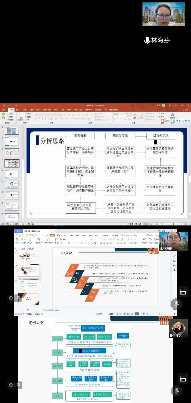 第一场“如何撰写和申报百优案例”讲座中,林海芬教授整体介绍了全国百优案例的类型及申报技巧,她结合具体案例分别对西部案例、微案例及普通案例的特点、写作要求、申报方法进行了详细地介绍;第二场“百优案例修改与打磨”中,各位老师或案例负责学生对其所撰写的案例进行逐一汇报,林海芬教授从案例标题、案例行文逻辑、教学目的与用途、启发思考题意义、案例说明书的分析思路等多个维度进行指导并提出修改建议。各位案例作者也就百优案例的申报和撰写与林海芬教授积极交流讨论,认真听取并记录指导意见!
