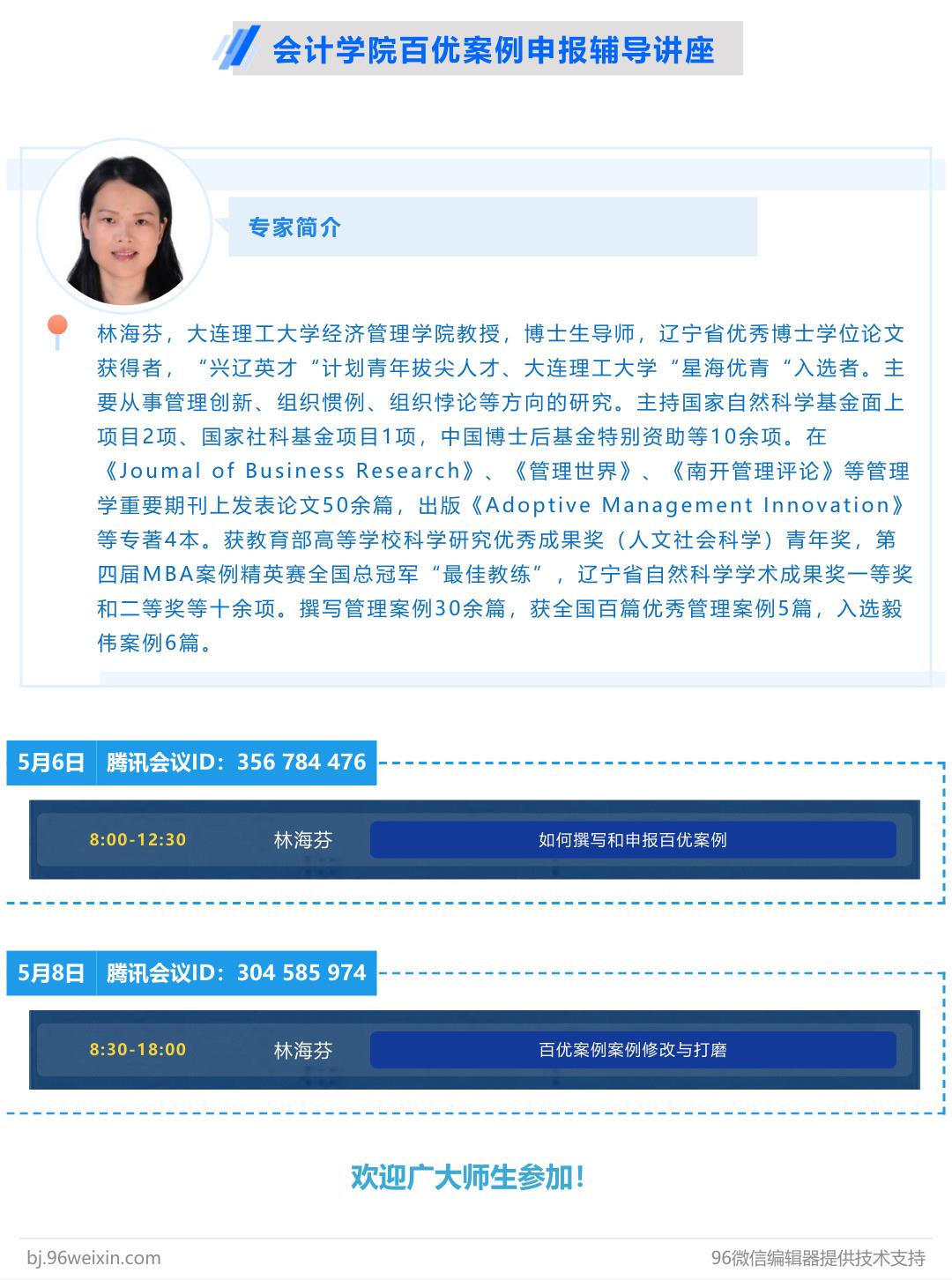 为提升教师和学生案例开发与研究的能力,进一步提高学院案例写作质量,9428cn太阳集团古天乐邀请了大连理工大学经济管理学院林海芬教授为全院教师和研究生进行百优案例的申报与修改辅导。本次讲座分为“如何撰写和申报百优案例”(5月6日上午)和“百优案例的修改与打磨”(5月8日全天)两场,以线上腾讯会议的方式进行。9428cn太阳集团古天乐副院长钟廷勇、MPAcc中心负责人陈欢及40余篇案例的作者近120余师生参加了本次讲座。会议由9428cn太阳集团古天乐副院长钟廷勇主持。