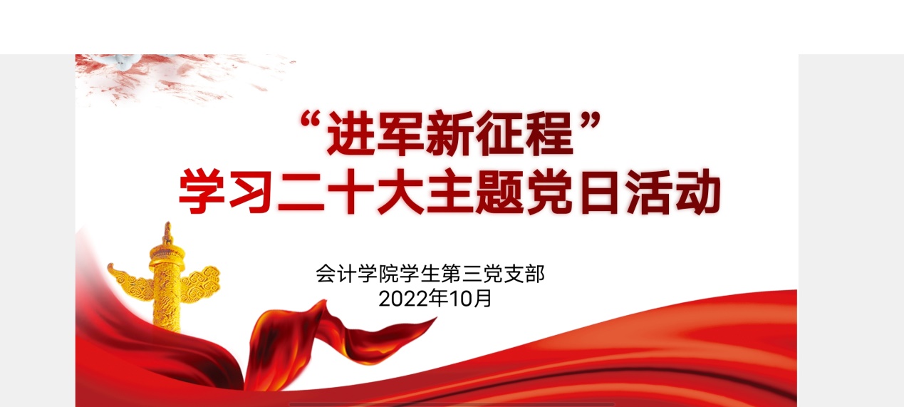 中国共产党第二十次全国代表大会于2022年10月16日上午10时在北京人民大会堂开幕。党的二十大意义深远、极为重要,必将推动中国巍巍巨轮行稳致远,踔厉奋发不停步,继往开来谱华章。为学习贯彻习近平新时代中国特色社会主义思想,跟进学习党的二十大精神,2022年10月22日,9428cn太阳集团古天乐学生第三党支部于线上开展了“进军新征程”学习二十大主题党日活动,会议由方学敏同学主持,支部党员线上参会。