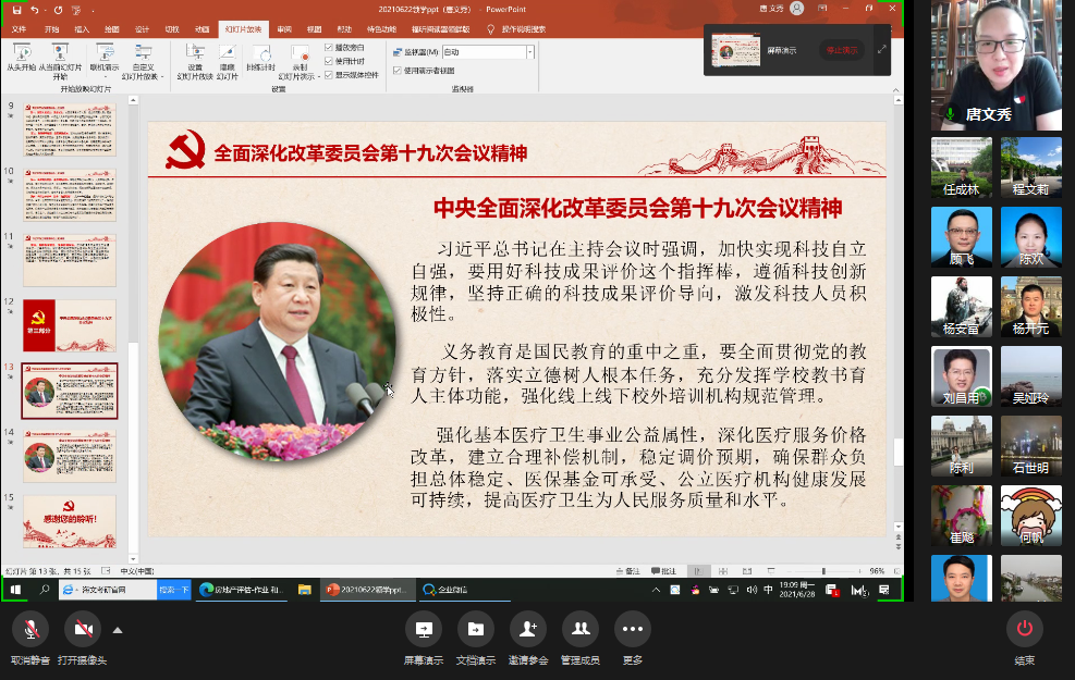 教工二支部宣传委员唐文秀同志首先传达学习了习近平总书记在推进南水北调后续工程高质量发展座谈会上的重要讲话、习近平在全球健康峰会上的讲话、中央全面深化改革委员会第十九次会议精神。她指出“流淌的是江水,润泽的是民心,共产党人带领我们实施南水北调,维护工程安全、供水安全、水质安全,携手并肩,共同守护人类健康美好未来。