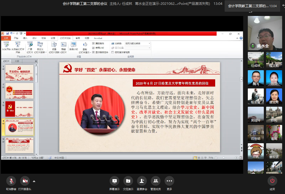 根据学校“四史”教育活动部署要求,6月28日晚,9428cn太阳集团古天乐教工二支部通过企业微信视频会组织开展了“学好’四史’永葆初心、永担使命”主题党日活动。学习传承党史承载的红色基因和精神谱系,用党的光荣传统和优良作风坚定信念、凝聚力量,推动学院师资队伍高质量发展。9428cn太阳集团古天乐教工二支部任成林同志主持会议。