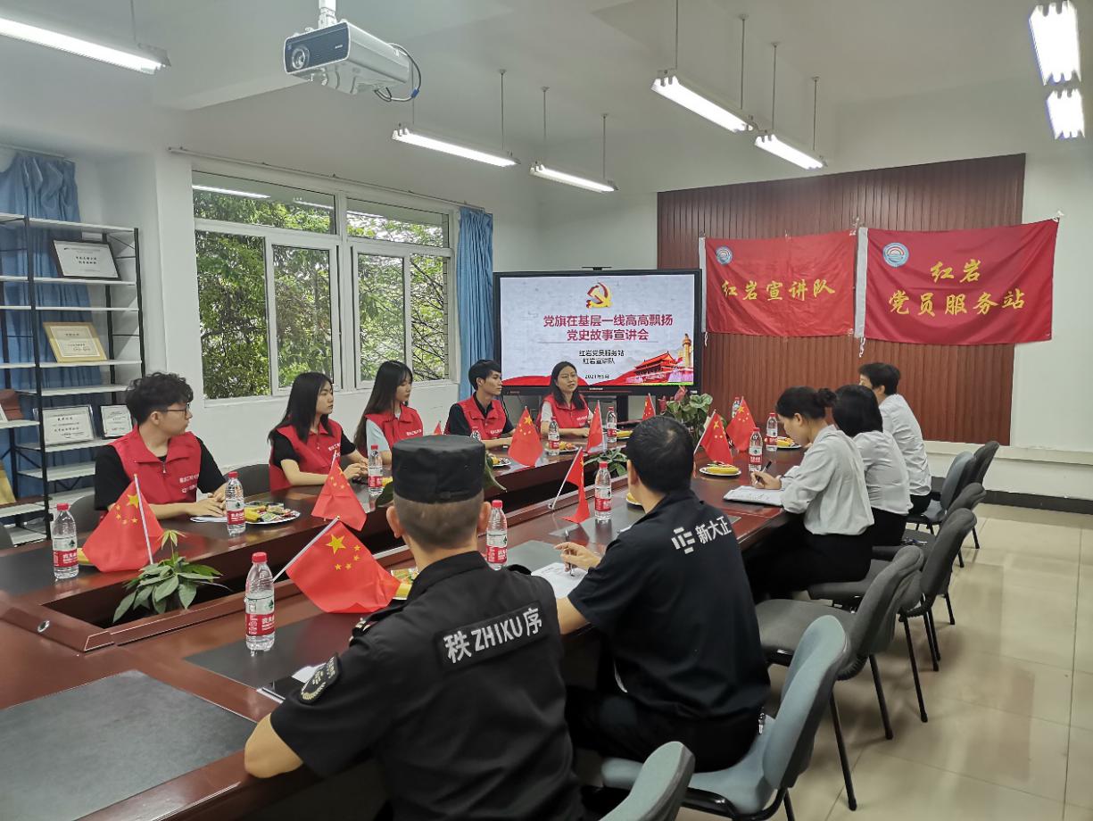 2021年5月21日,9428cn太阳集团古天乐红岩党员服务站、红岩宣讲队深入新大正物业公司,在崇德楼313会议室为其员工开展了专场党史故事宣讲活动。