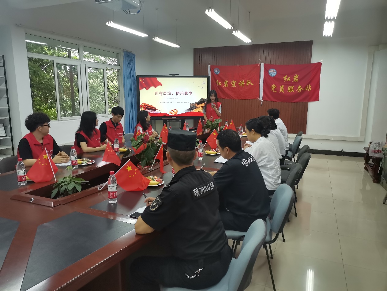 活动伊始,王婷老师向新大正物业的教职工代表们介绍了红岩党员服务站、红岩宣讲队以及“党旗在基层一线高高飘扬”活动相关情况,引导师生从党史故事宣讲中汲取前行的精神力量,做到学史明理、学史增信、学史崇德、学史力行。随后,由的三位红岩宣讲队代表为大家带来了非常精彩的党史故事。他们分别以赵世炎——“世有炎凉,仍乐此生”、黄继光——“穿越时空的家书”、毛泽东——“弥天大勇,深入虎穴”三则故事铺开了一幅“不因丧命而胆怯,惟愿吾身殉国难”的革命时期的壮阔画卷。现场人员无不被鲜活的故事讲述深深打动。最后,新大正物业邓娅莉经理为此次活动做了总结。她说物业服务管理水平直接影响到学生的生活环境、关系学生的幸福指数。因此物业从业者也应该积极向英雄模范学习,传承红色基因,以高质量的服务做好公寓社区工作。