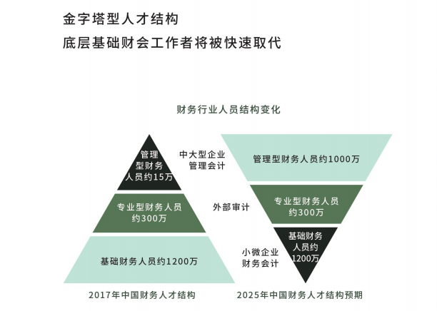 在我国,会计行业的从业人员庞大,人才结构呈现金字塔状:从事重复性财务工作的底层基础财会工作者人数较,基数大;金字塔塔尖即是注册会计师持证人。伴随财务机器人、财务共享中心等技术革新,底层基础财会工作将会被快速取代,财经行业急需的是具有综合财务知识、服务财经市场决策的复合人才!