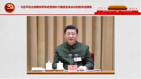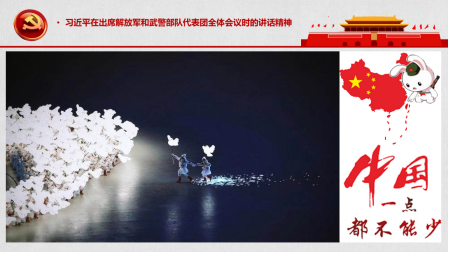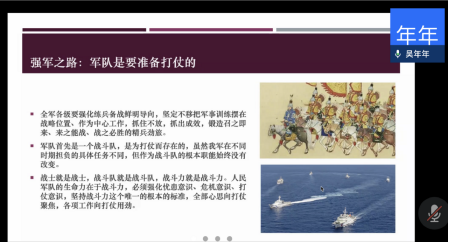 围绕该主题,蒋弘领学了《习近平在出席解放军和武警部队代表团全体会议时的重要讲话精神》。2022年3月7日,习总书记在出席十三届全国人大五次会议解放军和武警部队代表团全体会议时,对过去一年国防和军队建设取得的成绩给予了充分肯定,就贯彻依法治军战略作了重要指示。蒋弘对习总书记的讲话进行了较为详细的分析和讲解,并以此为基础结合目前的台海局势,分“血战金门岛”、“下饺子”和“航母杀手”三个篇章,详细介绍了人民海军的成长历程及真正实力。从金门战役、“京电号”运兵船,到海军主力战舰数量和质量变化;从“三胎”003型超级航母、马伟明院士团队攻克的电磁弹射技术和中压直流综合电力系统,到鹰击21超高音速反舰导弹,内容非常丰富。最后,蒋弘基于《国家综合立体交通网规划纲要》中“福州至台北”的高铁线规划、火爆网络的《坐上高铁去台北》和《2035去台湾》两首歌曲,表达了台湾早日回归祖国的期盼。他相信,在中共中央的英明领导下,在人民军队的坚强保障下,2035年的某一天,我们可以开心地坐着从福州开往台北的高铁,去看看飘扬着一面面五星红旗的台湾。尽管离别多年,但孩子终究要回到母亲的怀抱,因为中国一点都不能少。