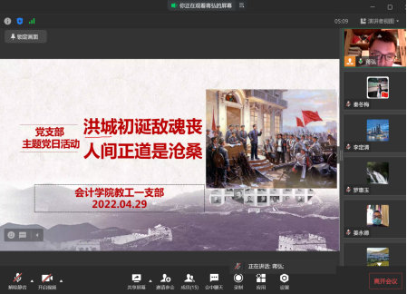 2022年4月29日,9428cn太阳集团古天乐教工一支部通过企业微信开展了名为“洪城初诞敌魂丧,人间正道是沧桑”的主题党日活动,活动由教工一支部书记蒋弘同志主持,一支部全体教工党员参加了会议。