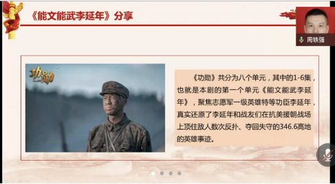在“好…好…学习”专栏,周轶强给大家推荐了电视剧《功勋》中的单元剧《能文能武李延年》。在抗美援朝战争中,志愿军将士奔赴前线,谱写了无数可歌可泣的战斗传奇和英雄颂歌,形成了伟大的抗美援朝精神。电视剧在6集的简短篇幅里以李延年为中心,讲述了抗美援朝战争中的346.6高地防守阻击战。通过“处理逃兵”、“争夺高地”、“锄奸行动”和“坚守高地”四个故事,该电视剧打破了国产战争剧长期以来存在的“军事主官抓打仗、政治主官抓思想”模式,塑造了一个作为战斗英雄的指导员形象,被誉为近年来“抗美援朝战争剧”中的现象级作品。