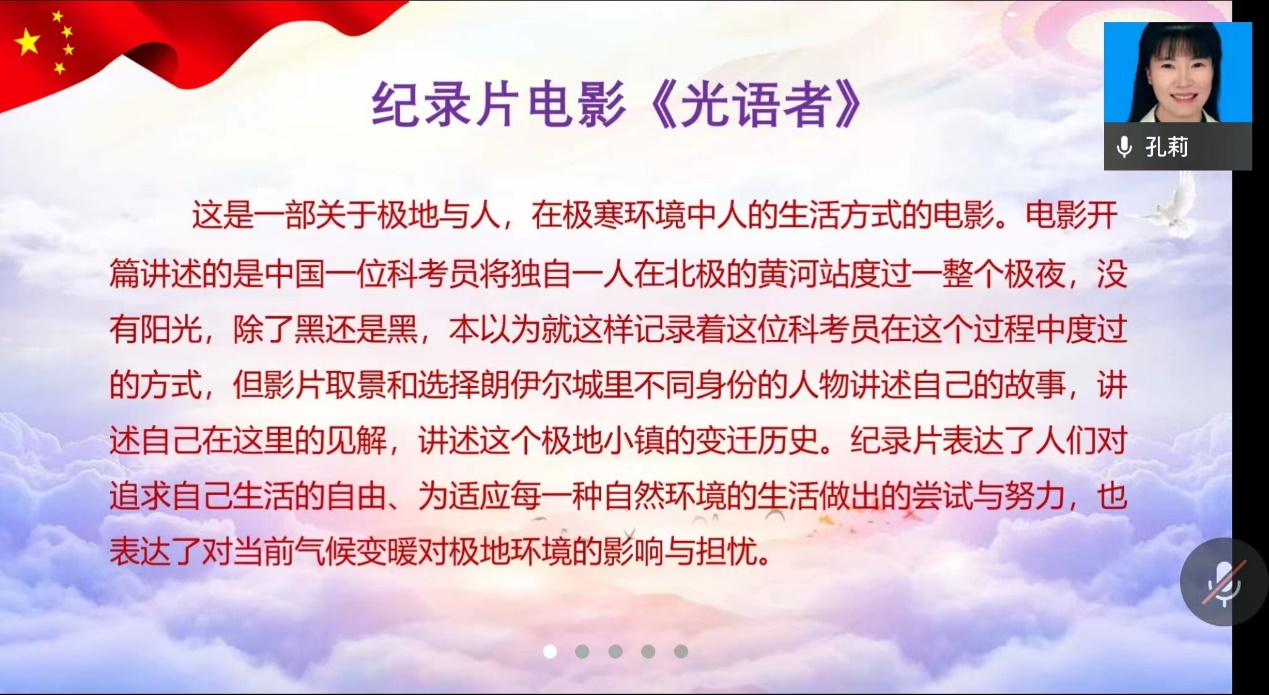 接下来的“好…好…学习”专栏,孔莉同志给大家分享了电影《光语者》。《光语者》是我国首部北极科考电影,记录了中国北极科考队员在冰雪天地中的工作和生活,展现了科考队员为我国科学探索承受的艰辛和做出的贡献。这部电影的主题符合习总书记在金砖国家工商论坛演讲中提到的“携手应对共同挑战”这一理念。孔莉指出,每个党员在工作和生活中要寻求光,既要照亮自己,也要照亮别人,要时刻对生活和工作充满希望和热情。